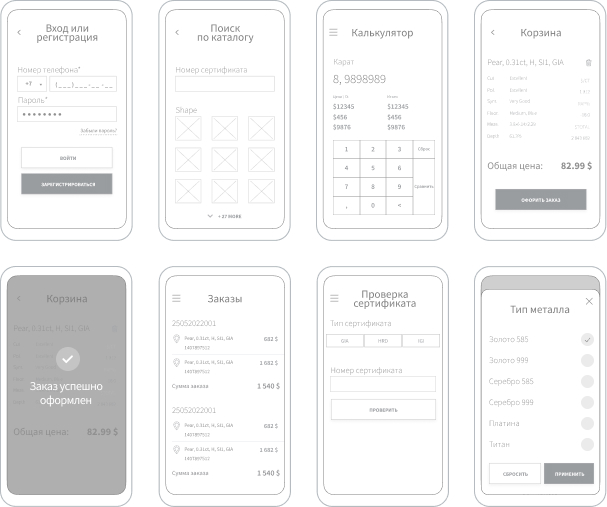 Разработать мобильное приложение первой в России международной биржи драгоценных камней с возможностями поиска и фильтрации по каталогу камней, оформлением заказа и отслеживанием статуса заказа непосредственно в мобильном телефоне.