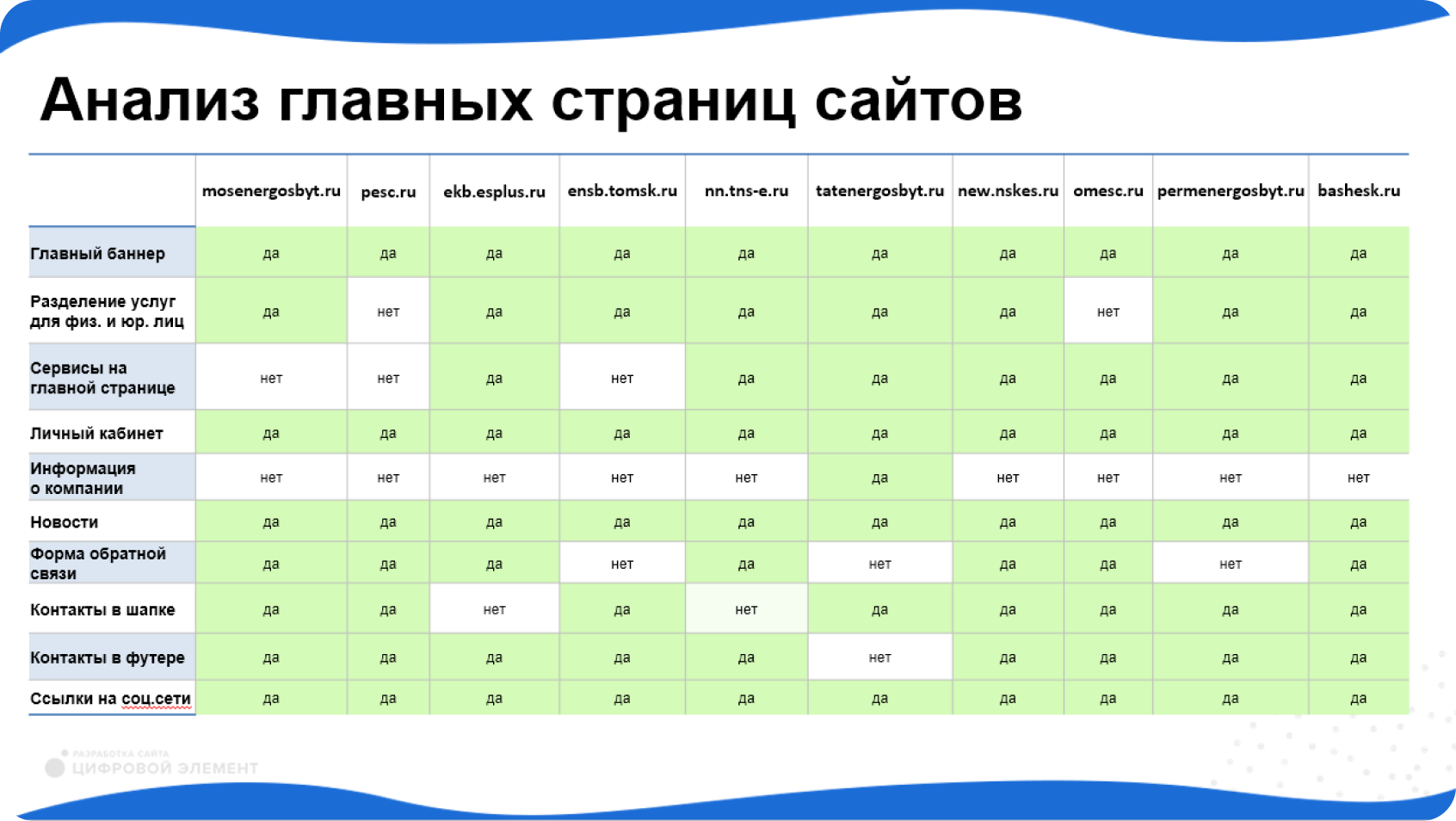 Для того, чтобы создать сайт, который будет удобен как юридическим, так и физическим лицам, и понять, как грамотно разделить информацию на нем, мы проверили предпроектное обследование по поведению клиентов Заказчика и проанализировали сайты других отраслевых компаний.