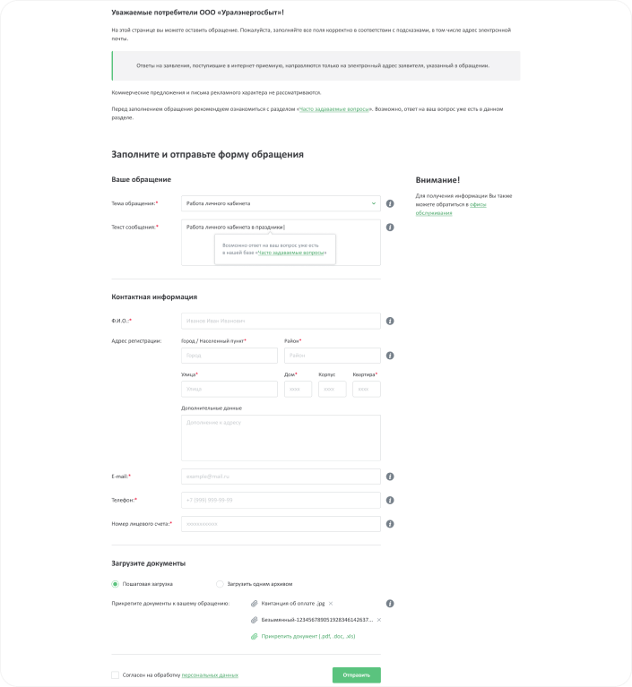 Все обращения разделены на темы, за каждой темой закреплен ответственный сотрудник Уралэнергосбыта. У пользователей есть возможность отправить свое обращение через сайт, не приходя физически в офисы Уралэнергосбыта. Для этого им необходимо выбрать тему обращения и заполнить все необходимые поля в появившейся форме.
