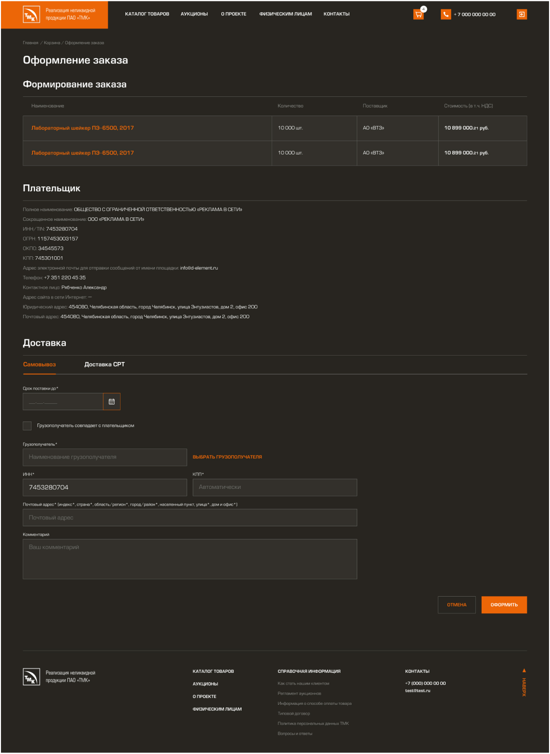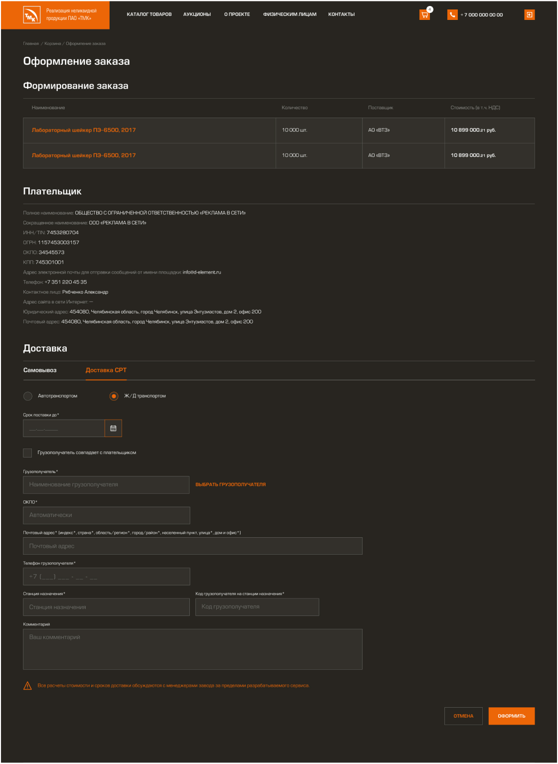 • Создание системы оформления заказов индивидуально для каждого предприятия группы ПАО «ТМК»